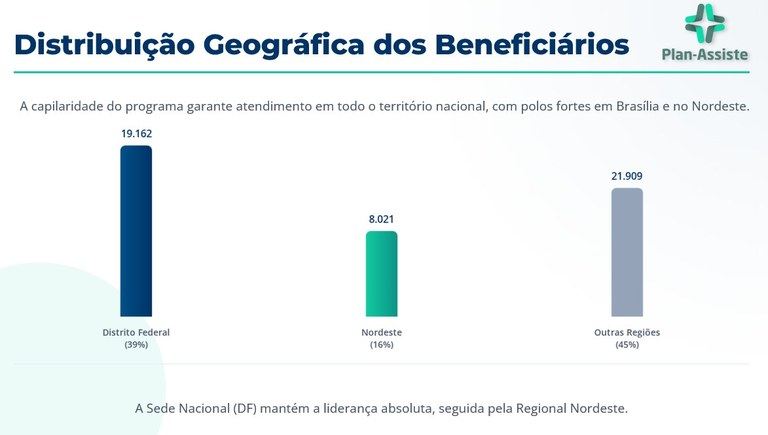 Geograficamente, a sede nacional, no Distrito Federal, mantém a liderança em número absoluto, com 19.162 usuários (39% do total). A regional do Nordeste figura em segundo lugar, reunindo mais de 8 mil beneficiários, o que equivale a 16% da base do programa.